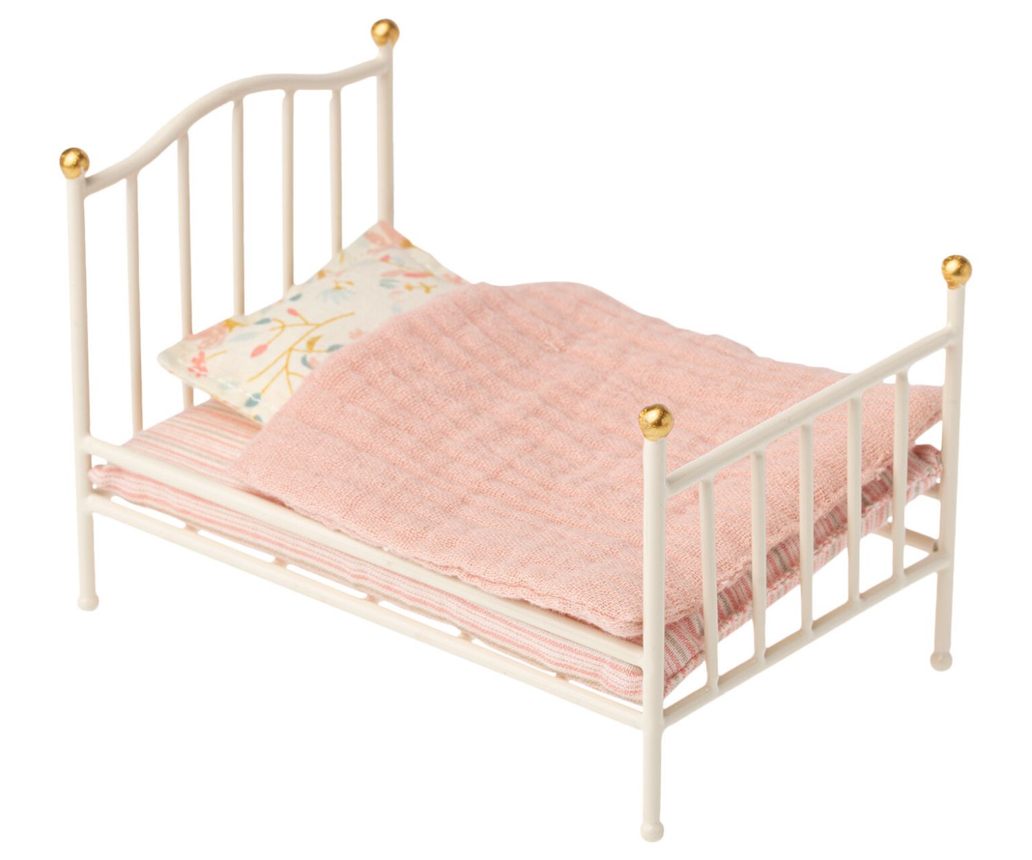 Cama Vintage Mini Off White Preciosa Camita Metálica de estilo Vintage en color Blanco roto ideal para Conejitos talla My y Ratoncitos de talla Babys y Hermanos pequeños. Incluye Colchón, Almohada y Edredón perfectamente combinado en diseño y colores. Medidas: 12,5cm Largo x 8cm Ancho x 8cm Alto