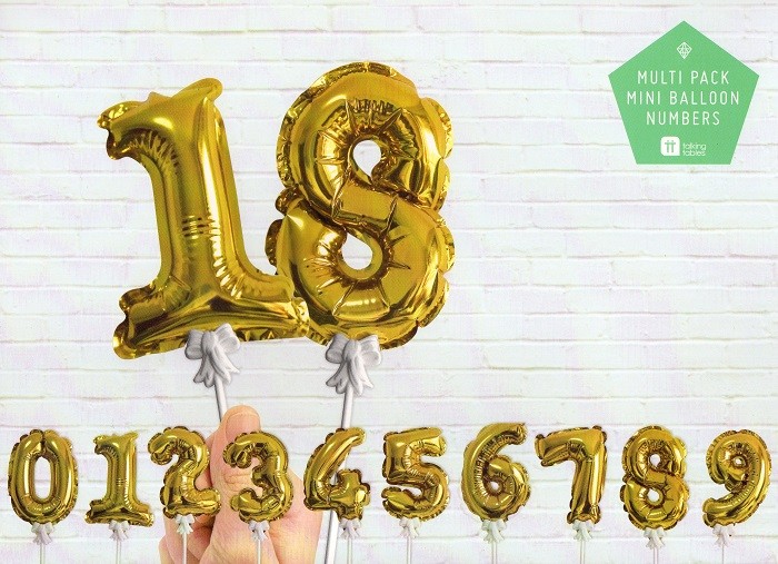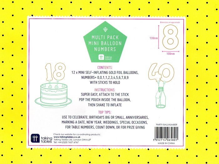 Topper Globos Números Dorados Pack de 12 Mini Globos con forma de números ( del 0 al 9 ) en Color Oro. Perfectos para la Decoración de Tartas, Cupcakes o Muffins en cualquier evento, Fiestas de Cumpleaños, Aniversarios, Celebración de fechas especiales... Excelentes como Meseros en Bodas y Comuniones... Pueden acompañarte también en las fotos de cuenta atrás de tu embarazo, incluso para las imágenes cumple mes una vez haya nacido tu bebé. * No necesitan Helio ya que son Autoinflables, al presionar su botoncito interior. * Incluye 12 Palitos Blancos de Plástico rematado con bonito Lazo. * Reutilizables y de larga duración. * Medida: 13cm Alto x 10cm Ancho Modo de Empleo: Fijar el Palito al Globo y presionar el botoncito interior para el autoinflado. Si lo deseas, puedes adornarlos con Lazos, Cintas, Mini Pompones, Mini Tassels de Papel....