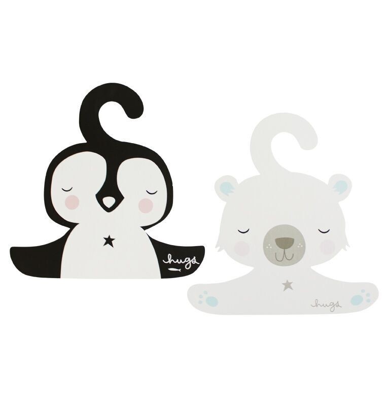Perchas Pingüino & Oso Polar Precioso conjunto de 2 Perchas con diseños diferentes de adorables animalitos, ideales para colgar la ropita de tu peque, además de ser un precioso objeto de decoración que lucirá espectacular en su habitación. Material: Cartón Prensado duro. Medidas: 26,6cm x 25cm