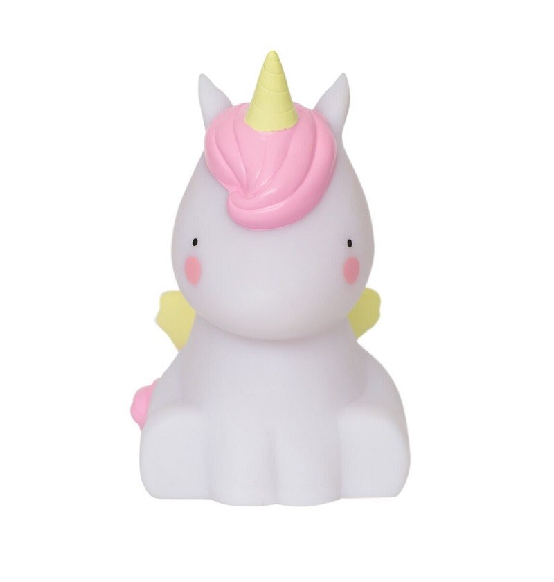 Lámpara Unicornio Preciosa Mini Lamparita quitamiedos con forma de Unicornio. Emite una suave luz de compañía, facilitando el sueño de los más pequeños. Debido a que la Luz incorporada es de Led, el material no se calienta, por lo que ofrece una gran seguridad para los niños. Fabricado en PVC libre de BPA y Plomo. Dispone de opción de encendido, apagado y temporizador, apagándose automáticamente a los 15 minutos, ahorrando de este modo la energía de las baterías. Funciona con 3 pilas LR44 ( incluídas ) Medidas: 8,5 x 12,5 x 10cm